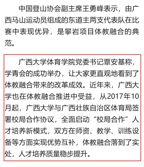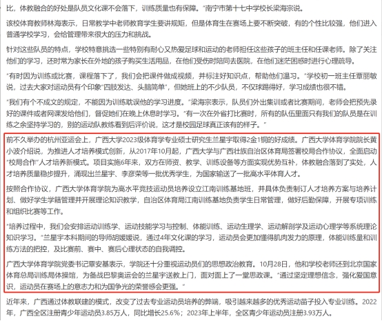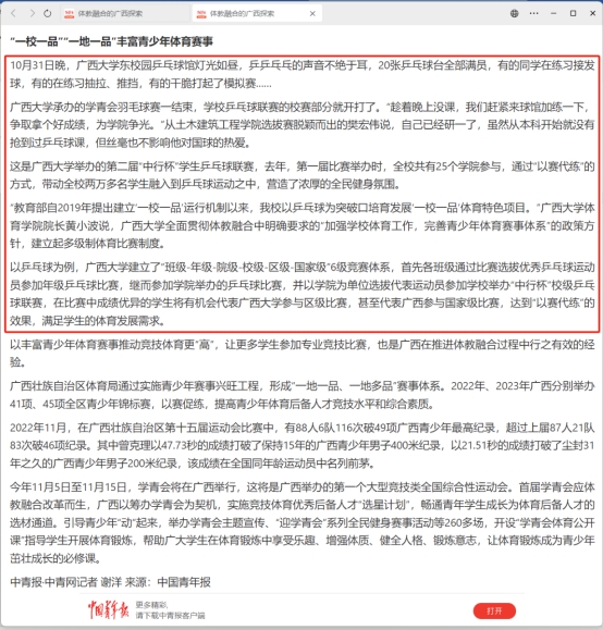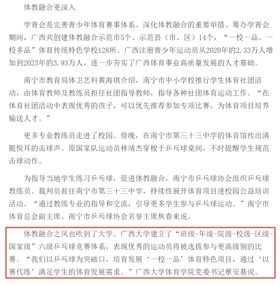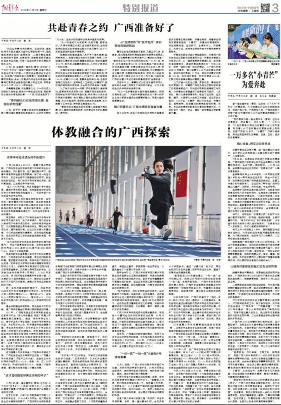 11月3日,《中国青年报》在当日第3版显著位置刊登了谢洋的署名文章《体教融合的广西探索》,集中报道了太阳集团2138体教融合发展的详细情况。
