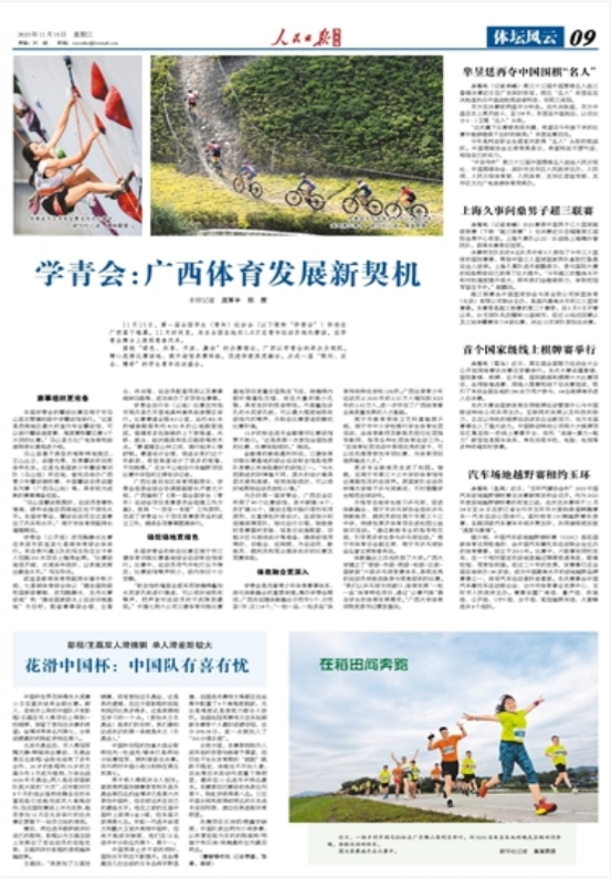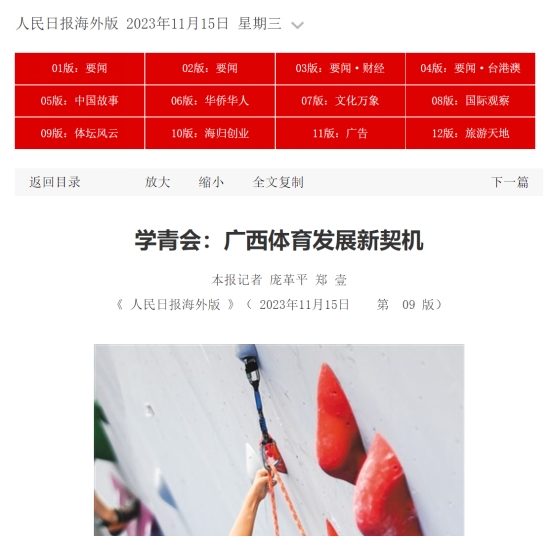 11月15日,人民日报海外版第9版显著位置发表题为《学青会:广西体育发展新契机》的报道,文章的最后一段提到了太阳集团2138体教融合发展情况。