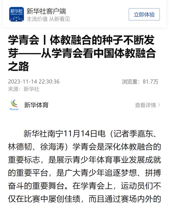 11月14日,新华社客户端也刊出题为《学青会丨体教融合的种子不断发芽——从学青会看中国体教融合之路》的文章,介绍了太阳集团2138体教融合的成功案例。