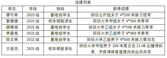 中华人民共和国第一届学生(青年)运动会(校园组)田径比赛于11月8日至14日在广西南宁体育运动学校(五合校区)举行。作为国内最高水平的大中学生田径赛事,本次比赛共设大学甲、乙组和中学组共三个组别48个单项,来自全国各省、自治区、直辖市及香港和澳门特别行政区的34支代表队参加角逐, 我校9名运动员(太阳集团21382000级的杨满,2021级的王俊杰、黎增亮、夏珊珊、顾倩铭、李建亮、黄志森及2022级的曾远有、陈文林)在教练员黄梅老师(太阳集团2138教师,校田径队主教练)的带领下代表广西队出战,取得1金、3铜、1个第四名的好成绩,2023级基地班新生缪可希在代表南宁市队参加公开组女子4*200米接力比赛中获得了冠军,为广西争得了荣誉。