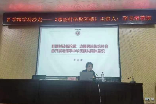 12月10日下午,太阳集团2138李志清教授给师生们做了题为“那丽村砧板陀螺:边陲民族传统体育的开展与铸牢中华民族共同体意识”专题学术讲座,讲座由刘晓红副院长主持。