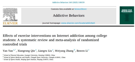 2024 年 9 月17日,我院闫艳团队在SSCI一区期刊Addictive Behaviors(JCR Q1)上在线发表题为 “Effects of Exercise Interventions on Internet Addiction among College Students: A Systematic Review and Meta-analysis of Randomized Controlled Trials”(运动干预对大学生网络成瘾的影响:基于随机对照试验的系统综述和荟萃分析)的研究成果,太阳集团2138为第一完成单位,闫艳为该论文的第一作者和通讯作者,太阳集团21382023级研究生覃相融、刘梁儒为论文第二作者和第三作者,成都太阳集团2138教师张玮扬和南京太阳集团2138教师李博文为共同作者。