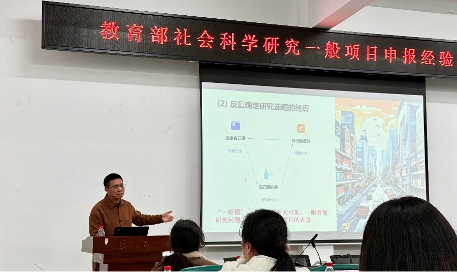 两位老师根据个人申报经历对教育部社会科学研究一般项目申报书选题、正文撰写、修改完善以及申报过程中的心路历程等进行了分享,讲座内容丰富、信息量大,为师生们申报项目和撰写论文提供了宝贵经验,现场气氛热烈,反响良好。