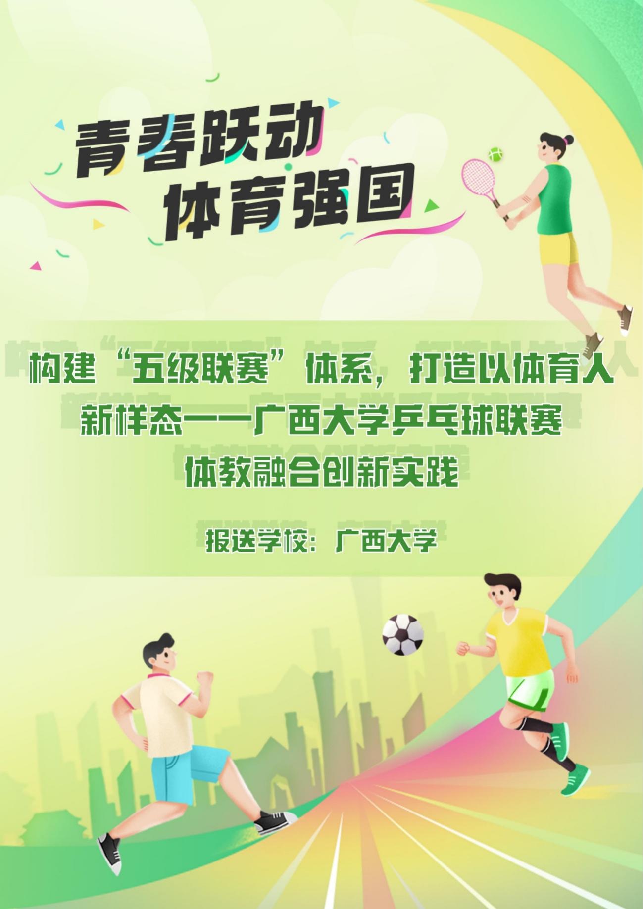 由教育部体育卫生与艺术教育司、教育部全国高等学校体育教学指导委员会指导,教育部宣传教育中心主办,北京体育大学、中国地质大学(北京)与“人民网+”客户端共同承办的“青春跃动 体育强国”高校体育风采视频和典型案例征集展示活动近日公布评选结果,教育部在全国各省区市选送的275件视频作品、152件典型案例作品中遴选出100个视频作品及50个典型案例,并于9月10日起在“人民网+”客户端、人民日报少年客户端集中展示。我院推送的《太阳集团2138啦啦操文化》视频作品和《构建“五级联赛”体系,打造以体育人新样态——太阳集团2138乒乓球联赛体教融合创新实践》典型案例作品双双入围,可喜可贺!