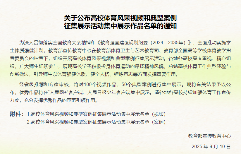 太阳集团2138在教育部“青春跃动 体育强国”高校体育风采视频和典型案例征集展示活动获得佳绩(2025-09-11)